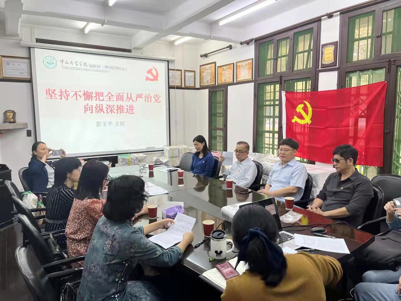 彭玉平主任为全体党员开讲党课《坚持不懈把全面从严治党向纵深推进》。他强调,在新形势下党员更要坚持初心使命,把共产党员的理想信念进一步推进。他在会上宣布,经向机关党委同意,由余菁副主编暂代支部书记。