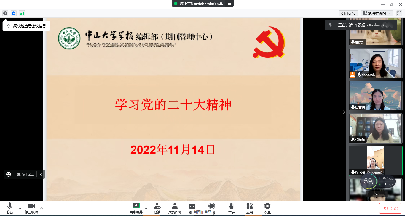 2022年11月14日上午,学报党支部通过腾讯会议召开线上党员大会,会议专题深入学习贯彻党的二十大精神,并对“两委”委员候选人初步人选第一次征求意见名单提出意见,会议由余菁书记主持,支部全体党员参加。因受疫情影响,本次会议采用线上会议的方式召开。