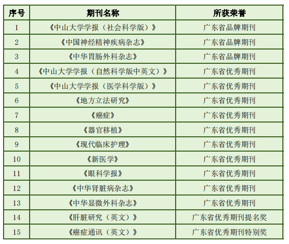 《中山大学学报(社会科学版)》《中国神经精神疾病杂志》《中华胃肠外科杂志》3种期刊获“第六届广东省品牌期刊”,《中山大学学报(自然科学版中英文)》《中山大学学报(医学科学版)》《地方立法研究》《癌症》《器官移植》《现代临床护理》《新医学》《眼科学报》《中华肾脏病杂志》《中华显微外科杂志》10种期刊获“第六届广东省优秀期刊”,《肝脏研究(英文)》获“第六届广东省优秀期刊提名奖”,《癌症通讯(英文)》获“第六届广东省优秀期刊特别奖”。