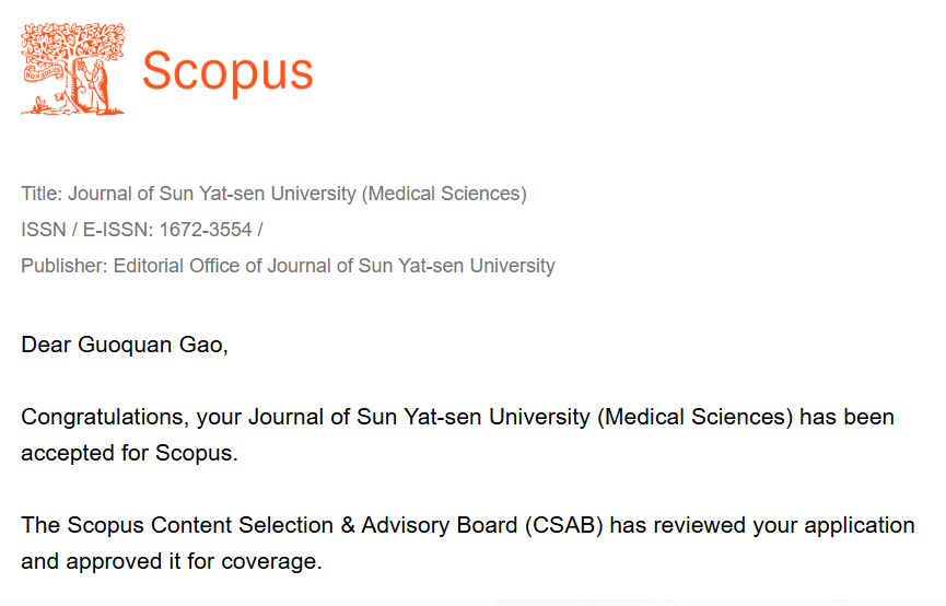 2025年10月22日,经过Scopus数据库遴选与咨询委员会的严格评审,《中山大学学报(医学科学版)》正式被全球最大的同行评议出版物文摘和引文数据库Scopus数据库收录。